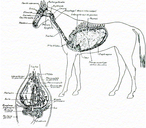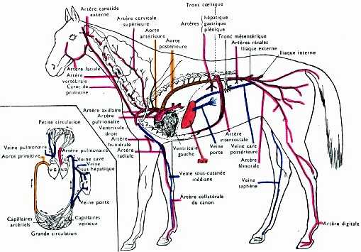 et ventricule gauche et droite). Le cœur, chez le cheval de taille moyenne, est de 26 cm de diamètre et pèse environ 3 kg ; il est situé dans la partie antérieure